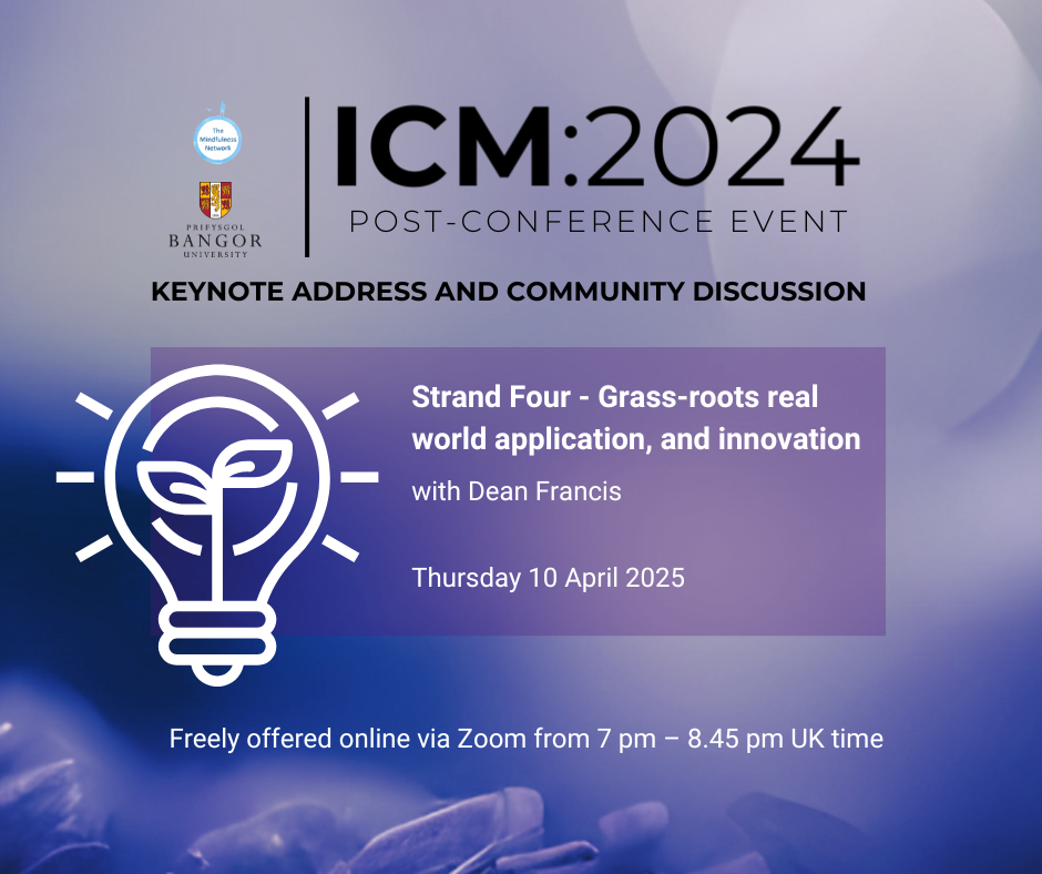 Following on from the International Conference on Mindfulness (ICM:2024), hosted by Bangor University and the Mindfulness Network, we invite you to continue the conversation with a series of monthly, donation-based events. Each session will explore a different conference strand theme, featuring a recorded keynote presentation and a community discussion.