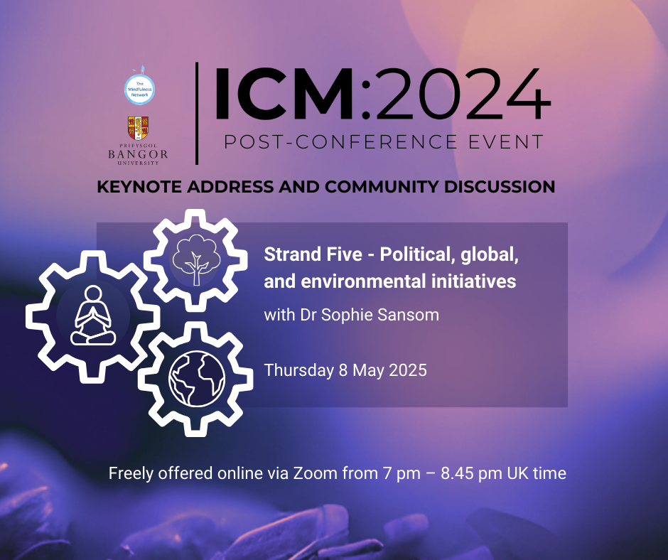 Following on from the International Conference on Mindfulness (ICM:2024), hosted by Bangor University and the Mindfulness Network, we invite you to continue the conversation with a series of monthly, donation-based events. Each session will explore a different conference strand theme, featuring a recorded keynote presentation and a community discussion.