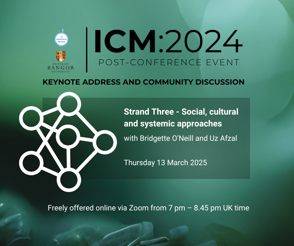 Following on from the International Conference on Mindfulness (ICM:2024), hosted by Bangor University and the Mindfulness Network, we invite you to continue the conversation with a series of monthly, donation-based events. Each session will explore a different conference strand theme, featuring a recorded keynote presentation and a community discussion.
